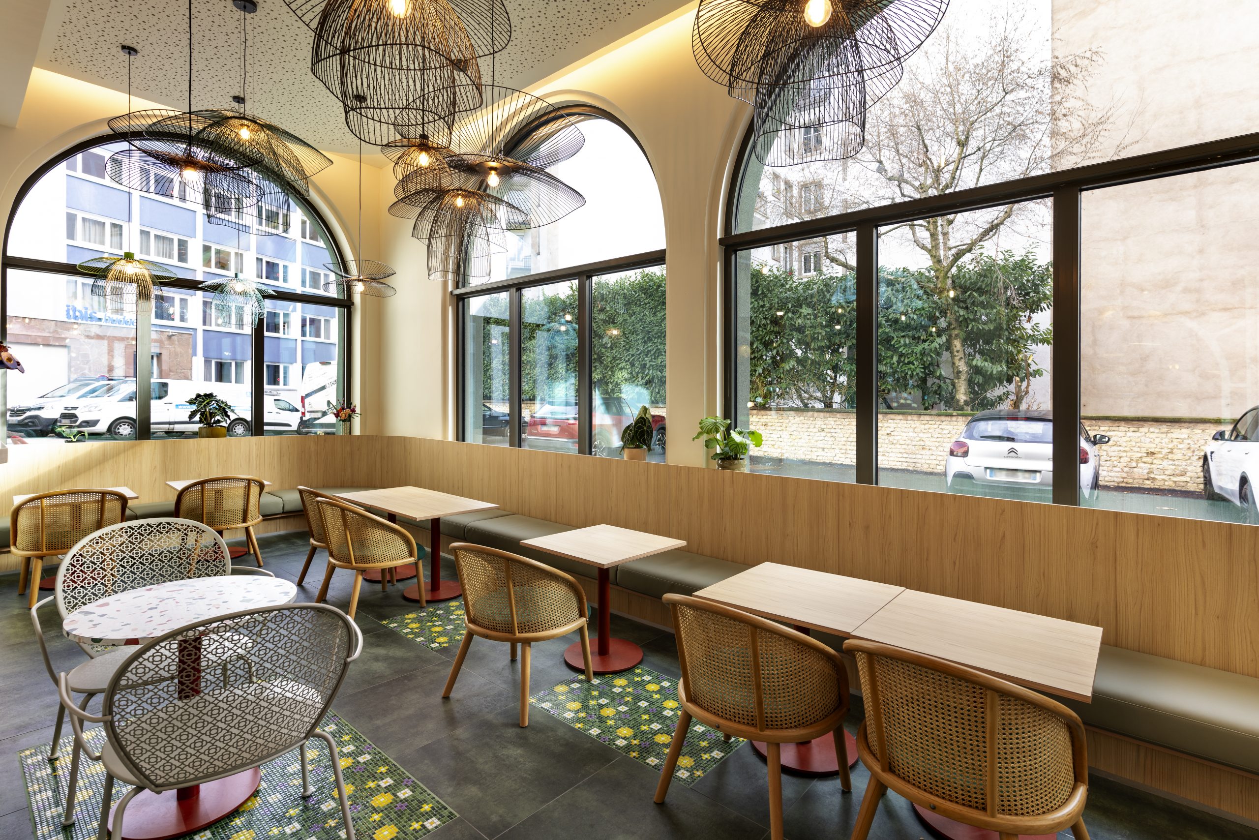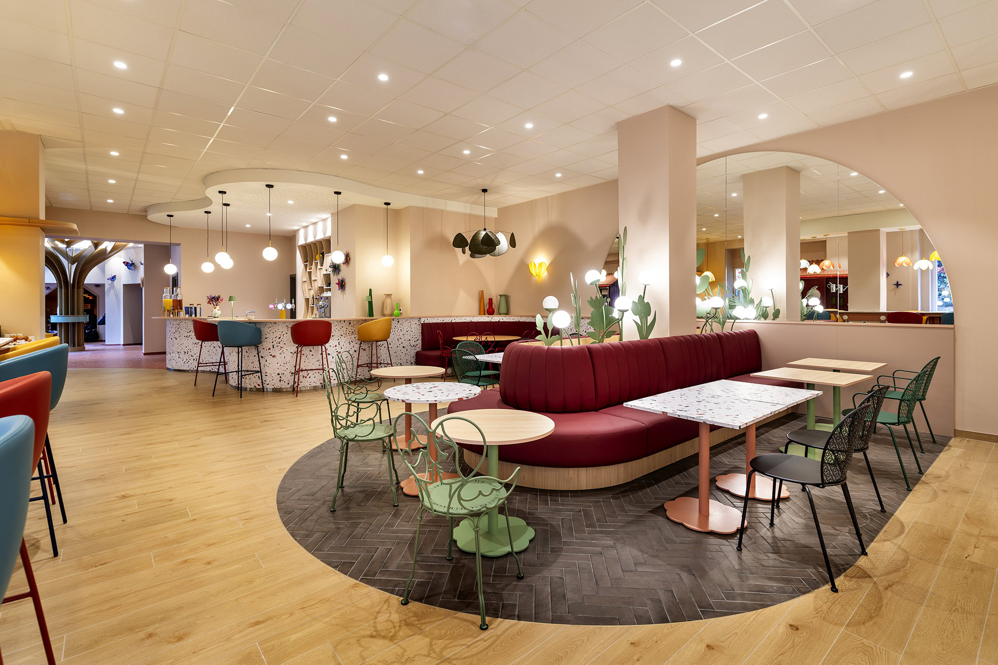 Avec son large bar, ses modules adaptables et différentes zones d’assises ce vaste espace offre différents usages selon les moments de la journée